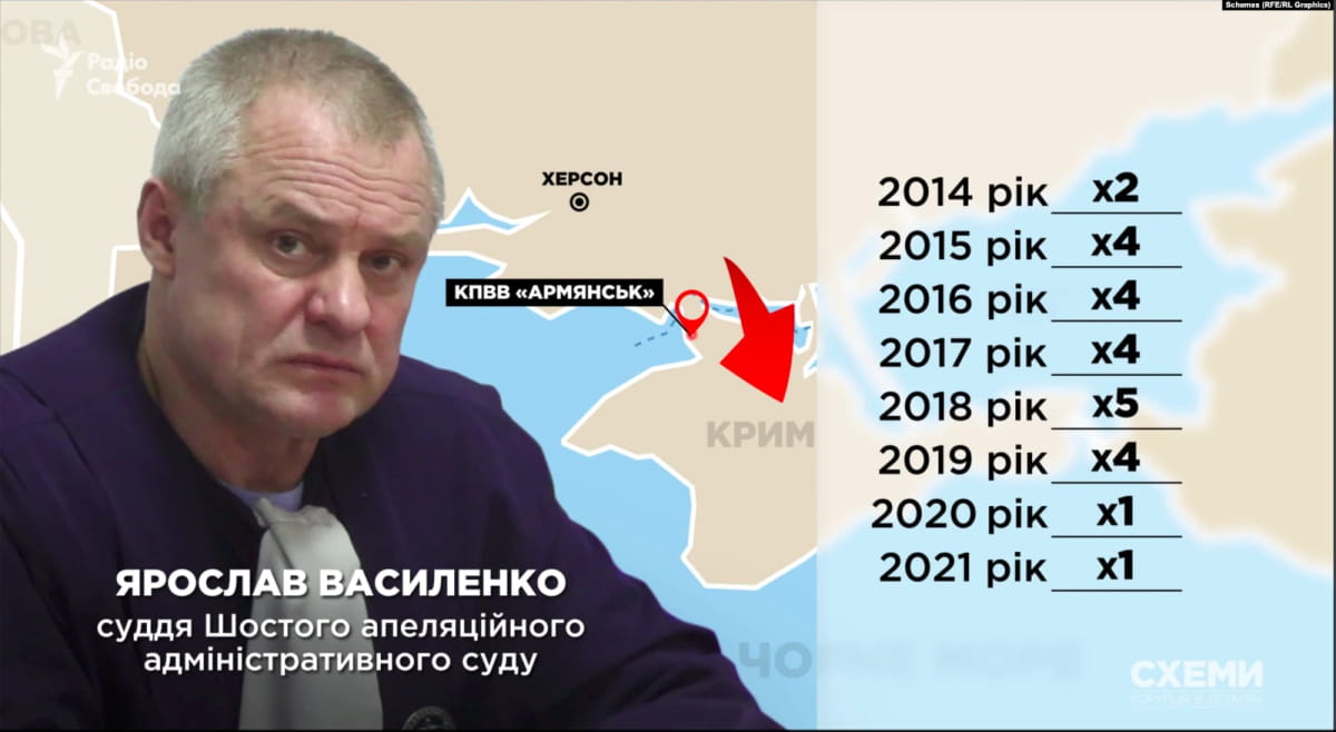 Журналисты получили данные о поездках Василенко из российской базы о пересечении границы, в которую власти россии после аннексии Крыма начали вносить данные обо всех, кто въезжает на оккупированный полуостров со стороны материковой Украины. "Схемы" выяснили, что с 2014 года украинский судья по несколько раз в год ездил в Крым, последний – 2021 г.