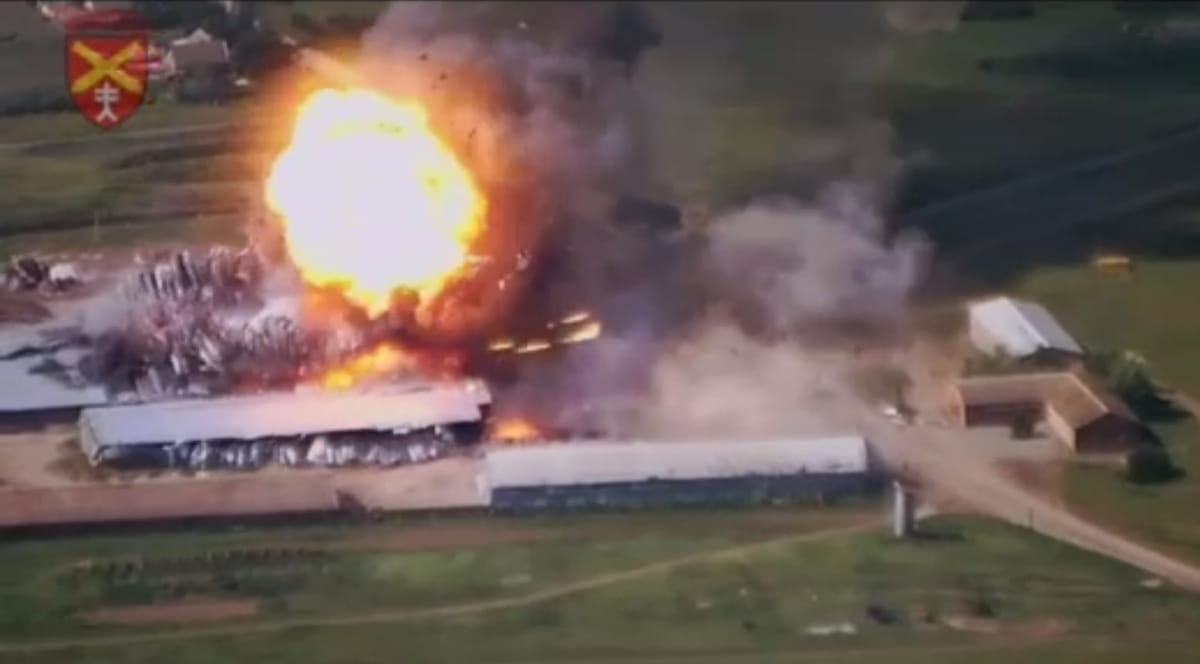 На записи, сделанной с помощью беспилотника, можно увидеть несколько попаданий наших артиллеристов по складу. Сначала там начался пожар, начали беспорядочно детонировать и вылетать ракеты. После чего произошел по-настоящему феерический взрыв боекомплекта, разнесший половину ангара.