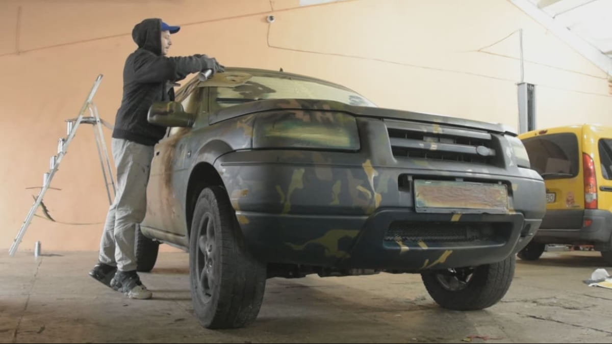Процесс камуфлирования автомобиля состоит из нескольких этапов: поверхность делают матовой и обезжиривают, покрывают базой разных цветов и на завершающем этапе наносят принт. При маскировке машин Сергей выполняет любые просьбы военных.
