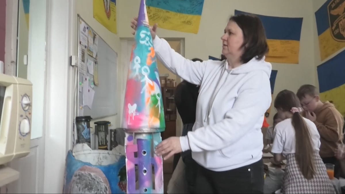 "Это оно прилетело в Запорожье. Эту штуку привезли из города Ямполя. Это возле Лимана она прилетела. Нам дал ее один военный и попросил, чтобы разрисовали ее целой, чтобы не разрезать. Дети на нем написали слово "победа", – рассказывает об экспонатах волонтер Вера Шварцкоп.