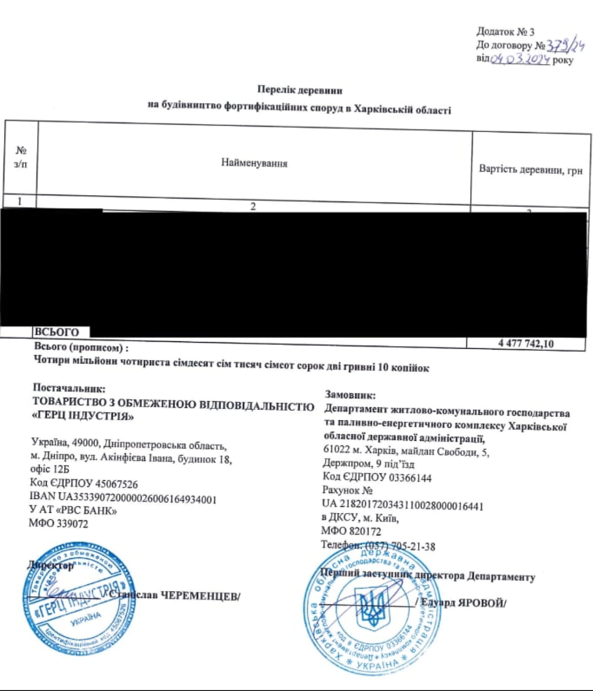 По ее информации, департамент ЖКХ и топливно-энергетического комплекса Харьковской ОВА заключил прямые контакты на 270 млн грн на поставку древесины для укреплений с якобы такими "ноунейм компаниями и ФЛПами":