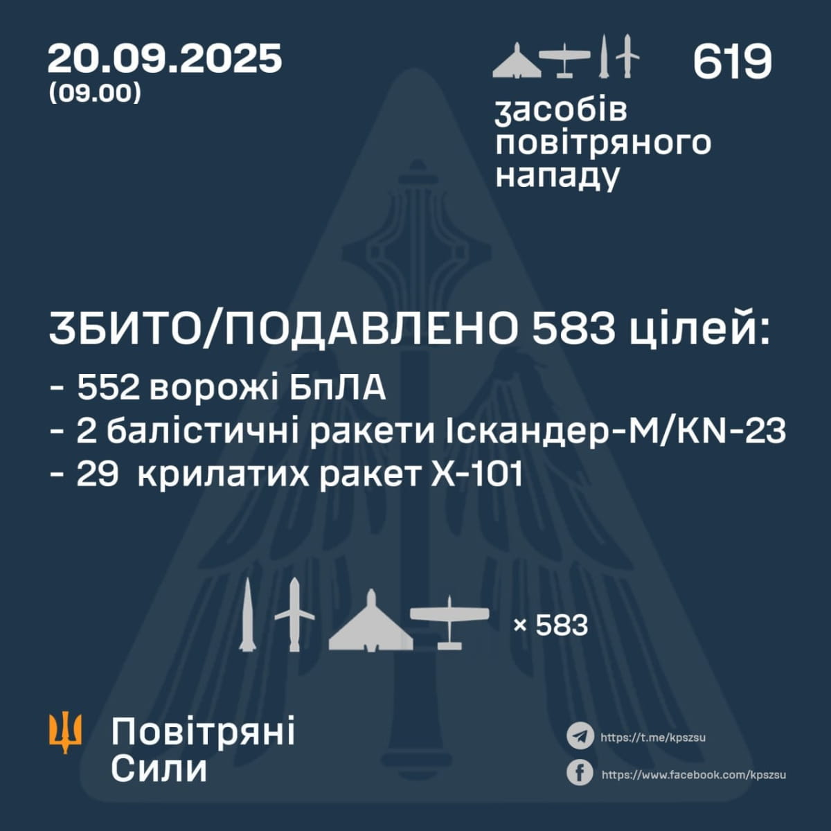 В ночь на 20 сентября противник нанес комбинированный удар по территории Украины с применением ударных БПЛА, ракет воздушного и наземного базирования. Об этом сообщают Воздушные силы.