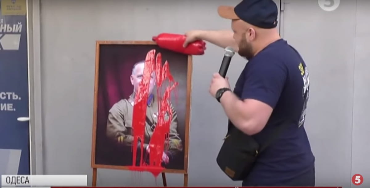 Чтобы этому помешать, одесские активисты устроили перформанс под названием "маршал смерти". Около полусотни патриотов принесли портрет Георгия Жукова и облили его красной краской. Место проведения выбрали поблизости от Приморского военкомата, где до сих пор стоит бюст советского полководца.