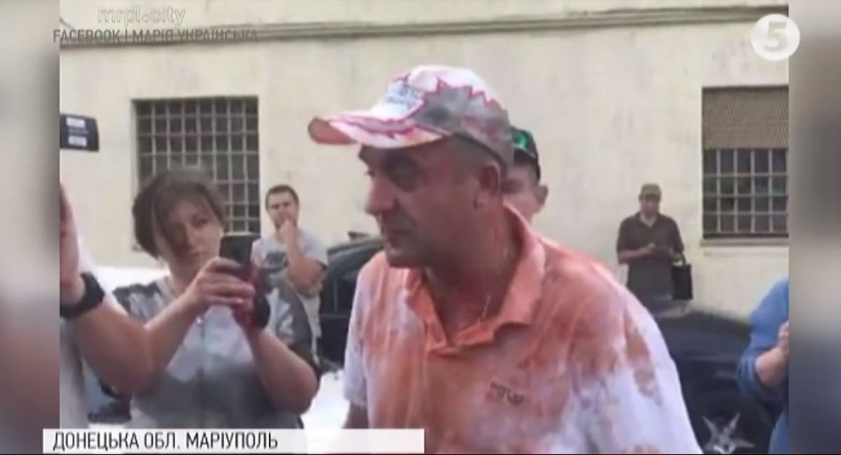 У стен Мариупольского СИЗО Кирсанова ждали жители микрорайона Восточный и активисты. Они окружили его и облили томатным соком и зеленкой. Некоторые из активистов держали в руках плакаты с надписями "Кирсанов – убийца", "Восточный помнит!".