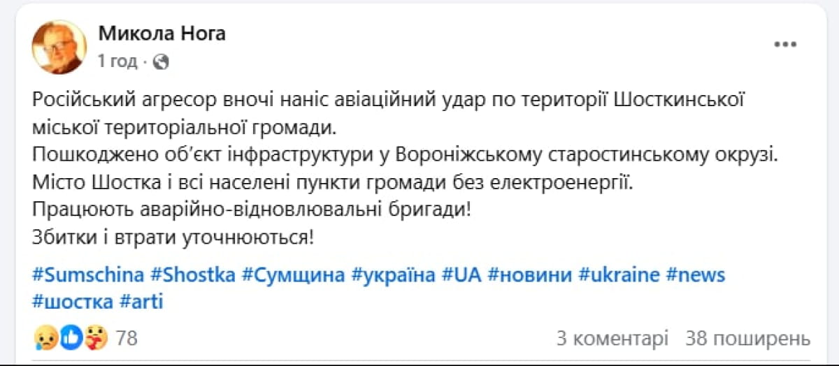 "Поврежден объект инфраструктуры в Воронежском старостинском округе. Город Шостка и все населенные пункты общины без электроэнергии", – отметил глава Шостки.