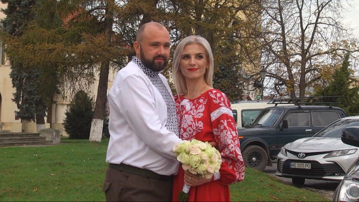 В ЗАГС Маричка пришла в вышитом собственноручно платье. Андрей в парадном кителе и сорочке, вышитой руками любимой. Андрей Пец на войне с 2014 года. В феврале после девяти месяцев на фронте бригада должна была вернуться домой, но полномасштабное наступление врага все изменило. Три месяца Андрей с 24 бригадой героически сражались за Луганскую область, теперь обороняют южные области Украины. Молодожены говорят, что война по-настоящему проверила их чувства.