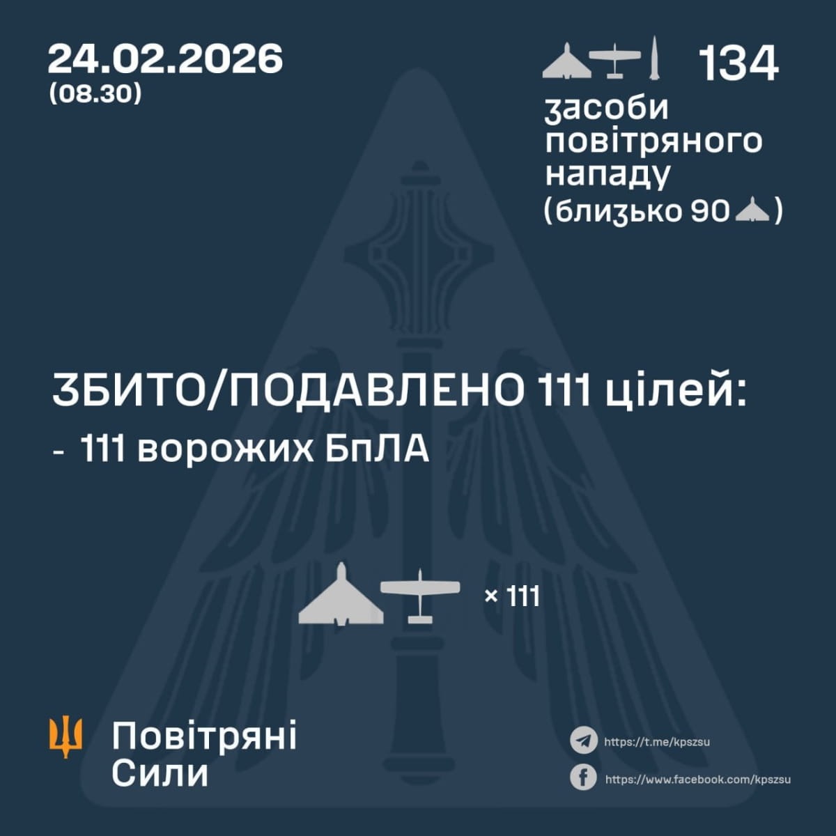 "По предварительным данным, по состоянию на 08:30, противовоздушной обороной сбито/подавлено 111 вражеских БПЛА типа Shahed, "Гербера", "Италмас" и дронов других типов на севере, юге и востоке страны", – говорится в сообщении.