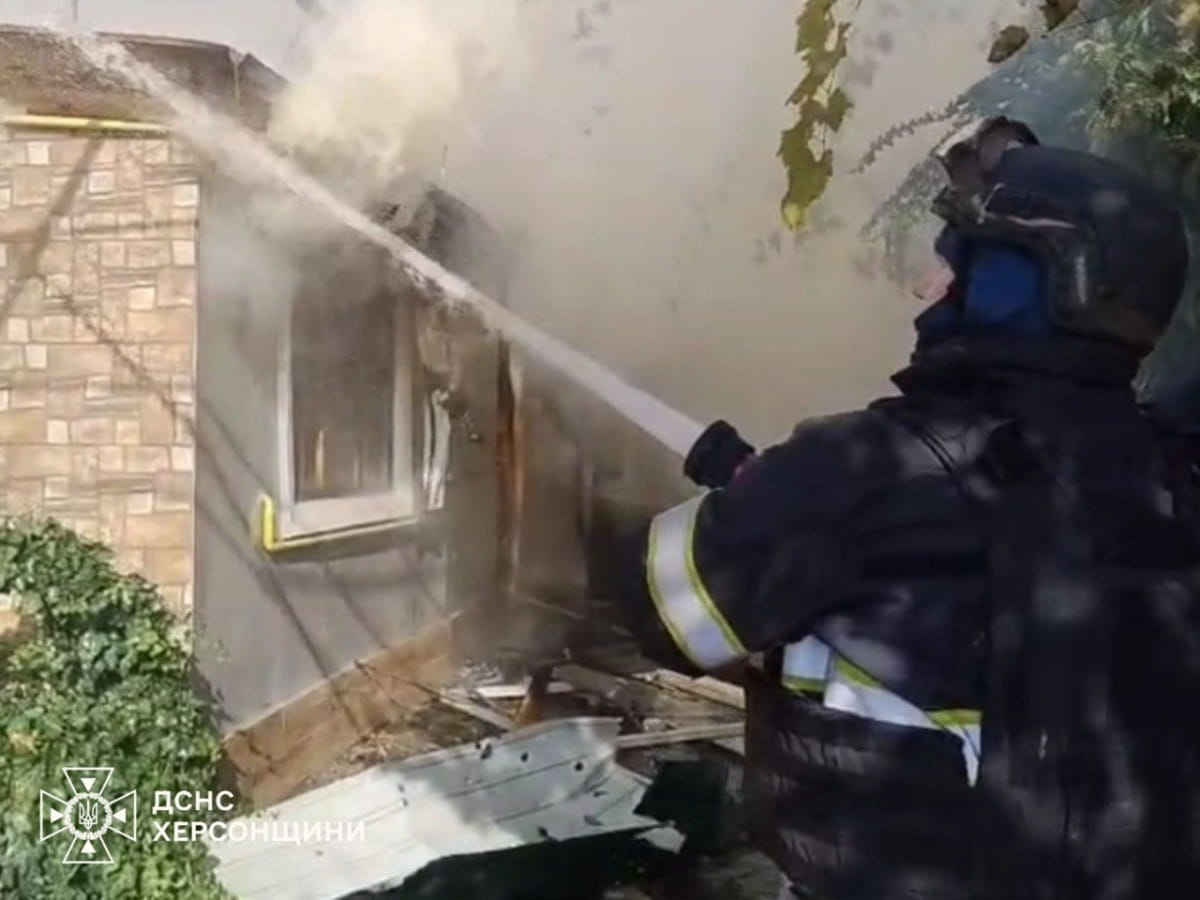 Сегодня днем после очередного артобстрела Херсона в одном из районов города вспыхнул одноэтажный жилой дом. На место происшествия прибыло подразделение ГСЧС, которое сразу начало тушение пламени.