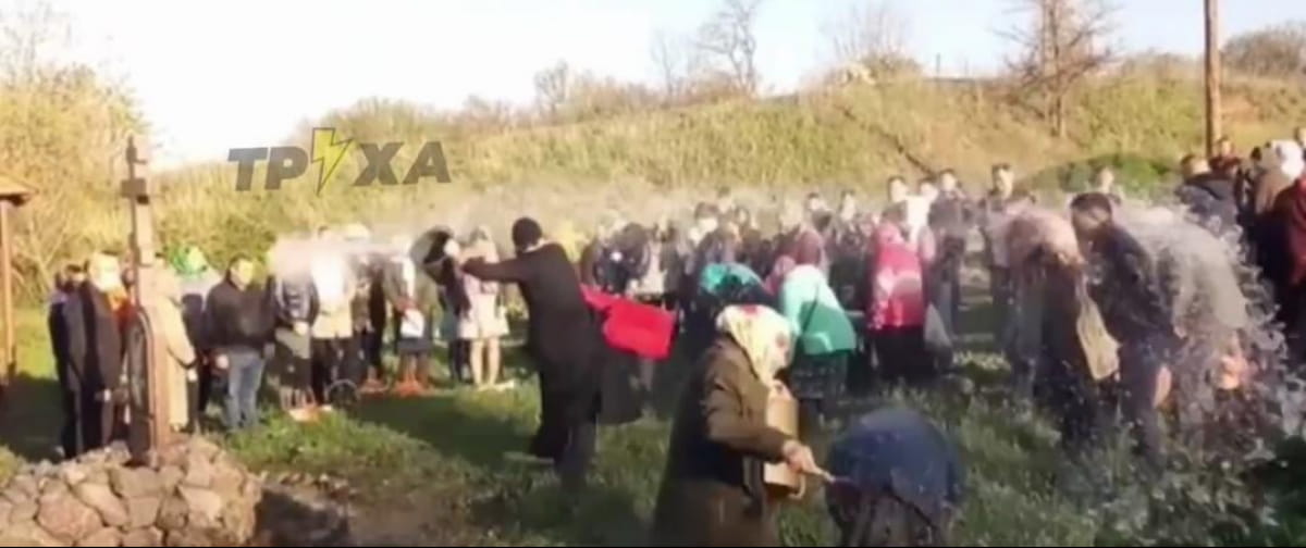 На видео хорошо видно, что и ведерка со священной водой при себе у служителя церкви не оказалось, поэтому прихожан в Пасху он окроплял прямо из ведра.
