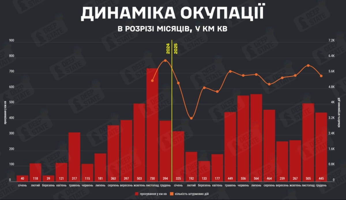 В декабре россия оккупировала 445 кв. км украинской территории, что на 12% меньше, чем в ноябре, в то же время количество штурмовых действий оккупантов уменьшилось на 9%. Об этом сообщает аналитический проект DeepState.