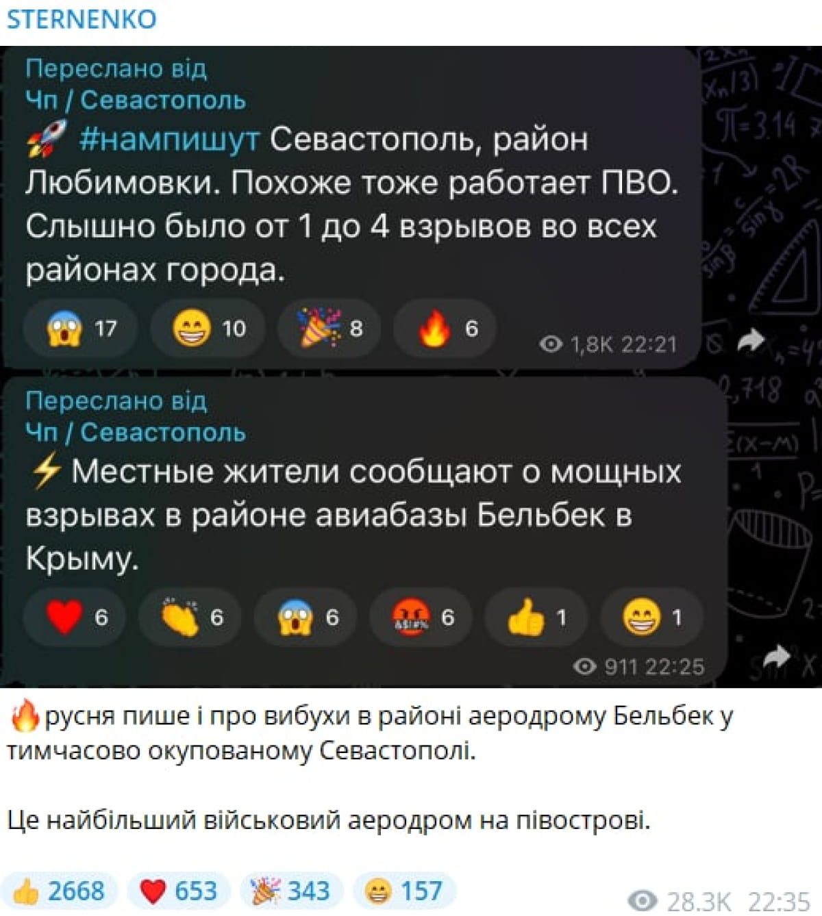 "русня пишет и о взрывах в районе аэродрома Бельбек во временно оккупированном Севастополе", – подчеркнул Стерненко.