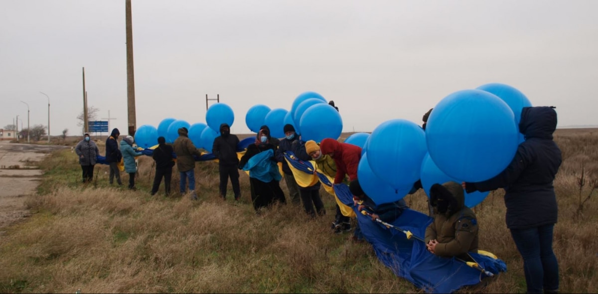 Кроме флага размером 20 на 6 метров в Крым также полетело около 7 тысяч листовок. Активисты выстроились в шеренгу возле пункта пропуска "Чонгар", на границе с оккупированным полуостровом, и с помощью воздушных шариков запустили огромный сине-желтый флаг.