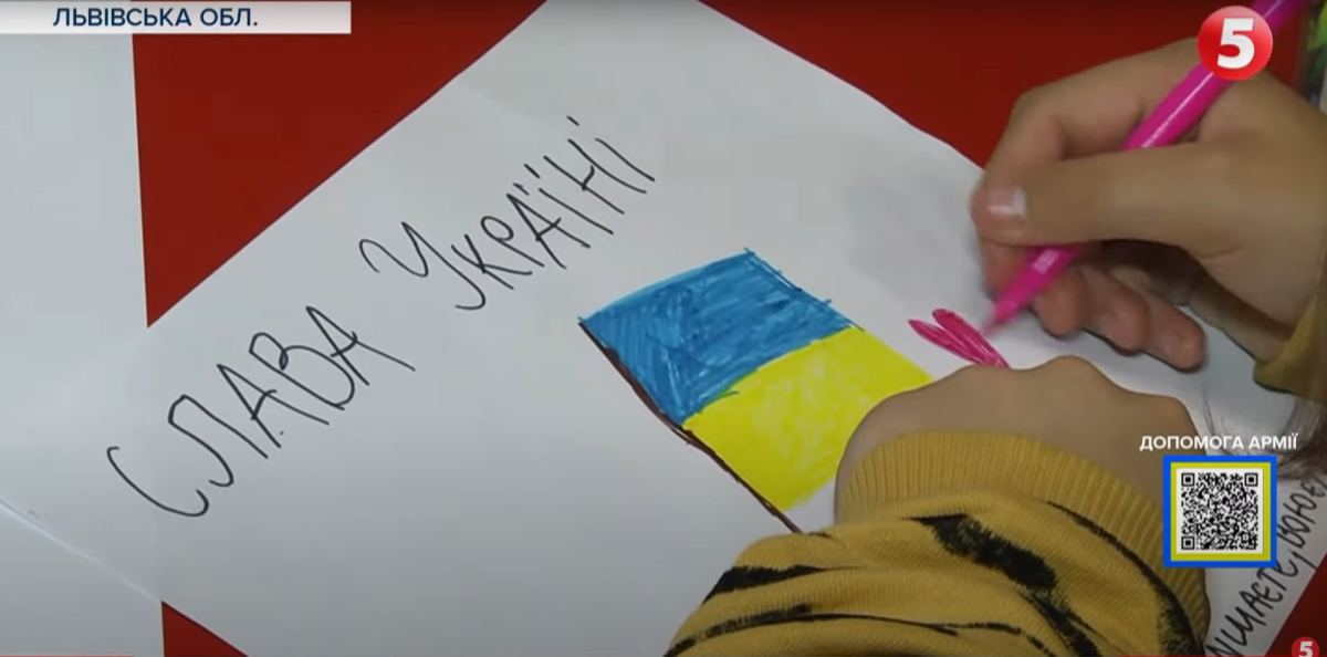 На детских рисунках сине-желтый цвет. Государственные символы, цветы, воины, танки и слова-пожелания. Самое главное, говорят дети, чтобы все защитники вернулись домой, и Украина победила.