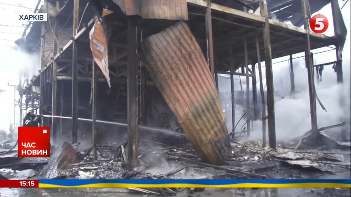 Руководство рынка пока подсчитывает ущерб и точное количество уничтоженных и поврежденных магазинов.