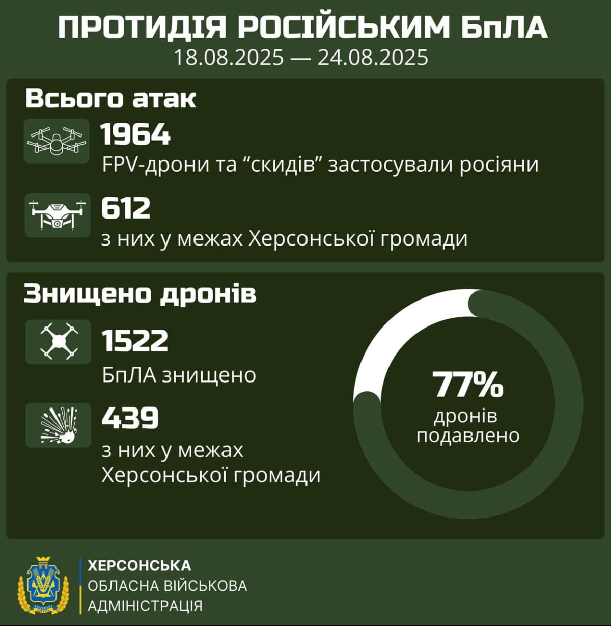 В целом с 18 по 24 августа из 1964 запущенных российскими войсками беспилотников украинским защитникам удалось нейтрализовать 1522.