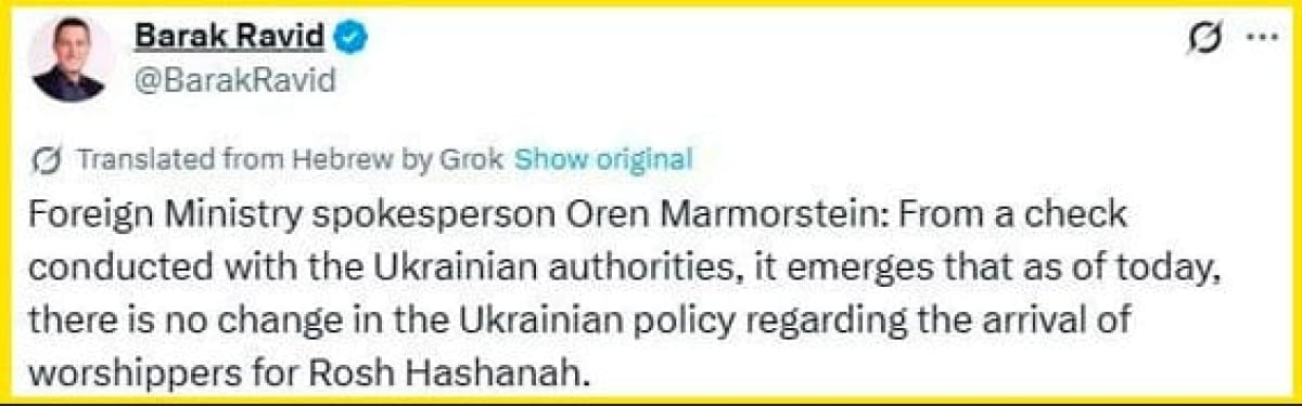 "По состоянию на сегодняшний день нет никаких изменений в политике Украины относительно прибытия верующих на Рош ха-Шана", – цитирует Axios спикера МИД Израиля.
