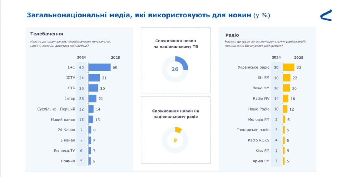 23 сентября ОО "Интерньюз-Украина" представила результаты национального исследования о потреблении новостей и доверии к украинским медиа в 2025 году. Опрос выполнила компания InMind в мае – августе этого года.