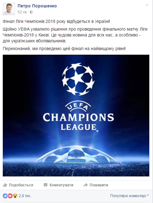 Крім того, як зазначив Президент Петро Порошенко, "це чудова новина для всіх нас, а особливо - для українських вболівальників. Переконаний, ми проведемо цей фінал на найвищому рівні!".