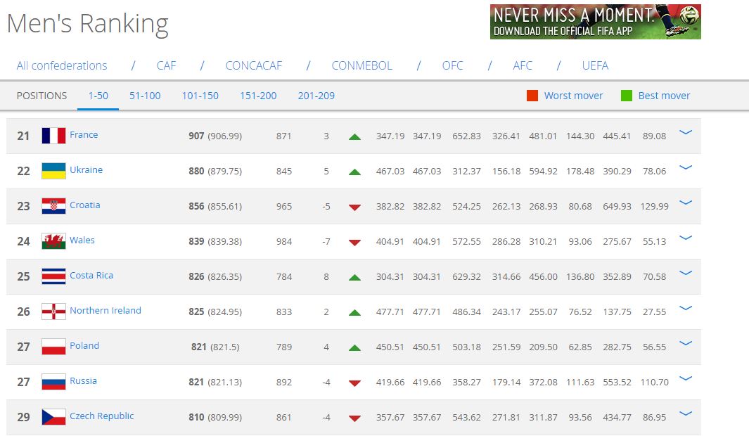 Україна випередила низку суперників завдяки двом мінімальним перемогам в товариських матчах над Кіпром і Уельсом, і вийшла на 22-е місце, поруч з Францією і Хорватією.