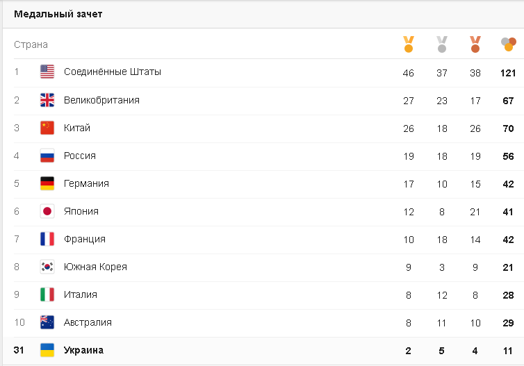 Протягом Олімпіади Україна завоювала 11 медалей, з них – два золота, п'ять срібних медалей і чотири бронзи і зайняла 31-е місце в неофіційному командному заліку. На першому ж місці США із 121 медаллю, 46 із яких золоті.