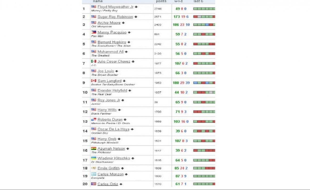 Зауважимо, що першу сходинку рейтингу посів непереможний американський боксер Флойд Мейвезер.