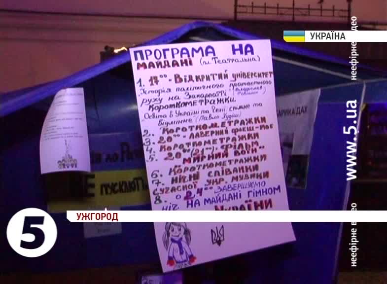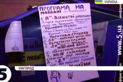 Домовившись у соцмережах, за кілька годин в центрі міста зібралися люди і, як і в столиці, запалали бочки для обігріву. Тепер на Майдані хочуть проговорити стратегію спротиву та плани на майбутнє. Збори тривали до опівночі, активісти слухали лекцію про історію політичного протестного руху на Закарпатті в рамках вуличного університету, провели ліхтариковий флеш-моб та показали кілька короткометражних освітніх фільмів.