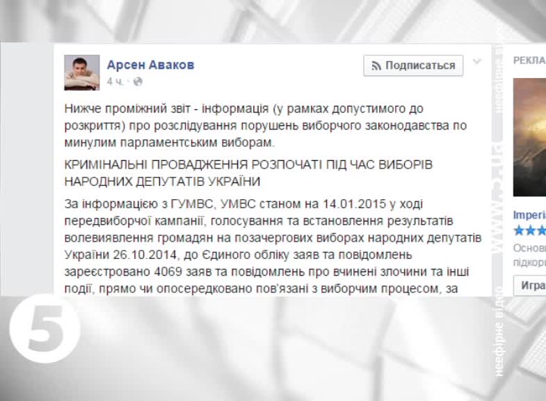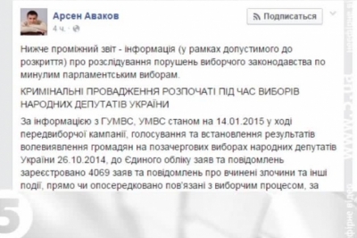 Про це у Facebook повідомив міністр внутрішніх справ Арсен Аваков. За його даними, більшість справ стосується підкупу виборців.