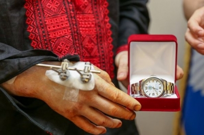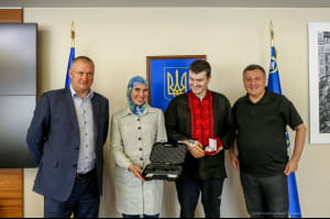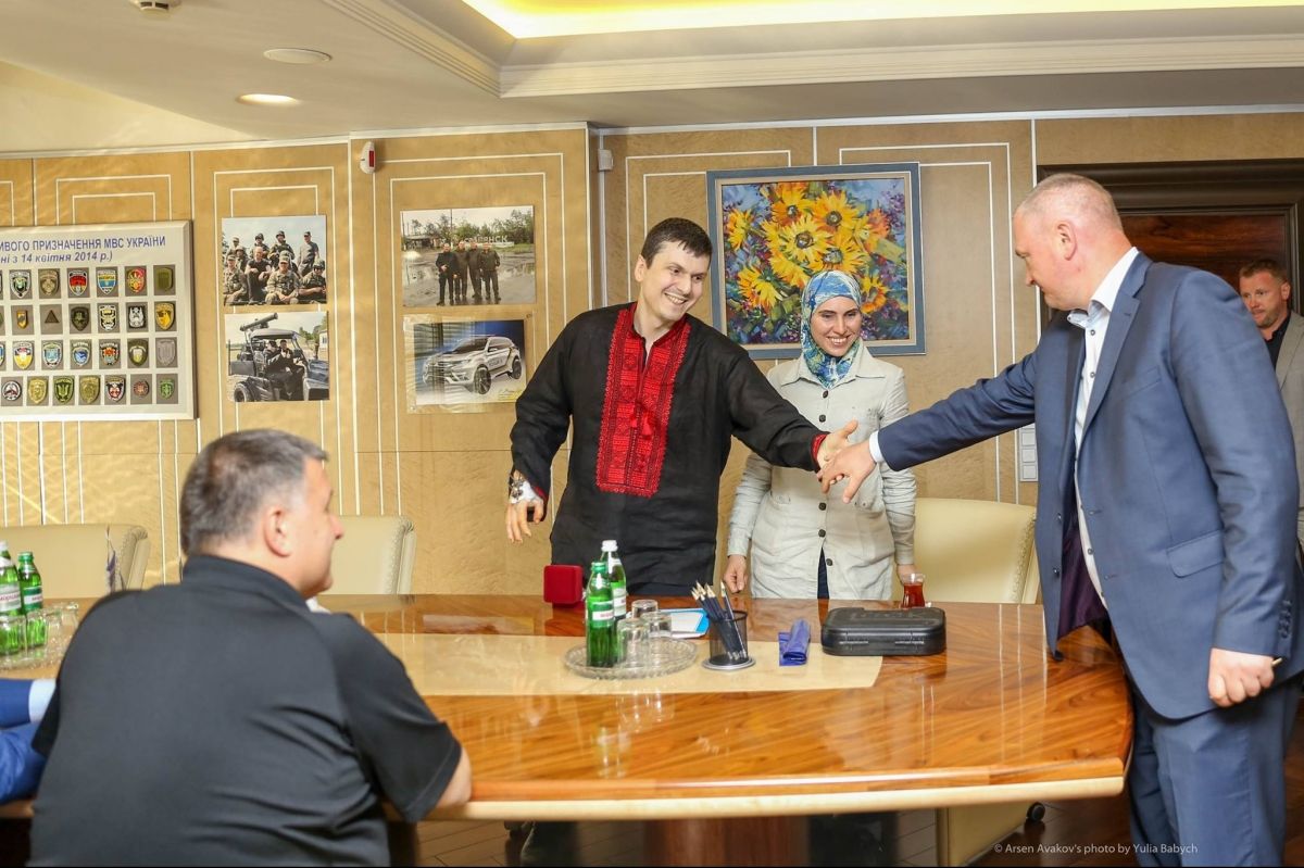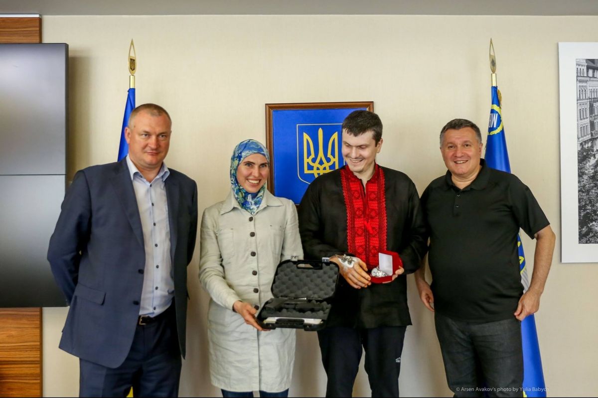 Міністр внутрішніх справ України Арсен Аваков нагородив Аміну Окуєву та вручив їй пістолет Glock-43, а пораненому унаслідок замаху добровольцю АТО Адаму Осмаєву – годинник. Про це він повідомив на сторінці у Facebook.