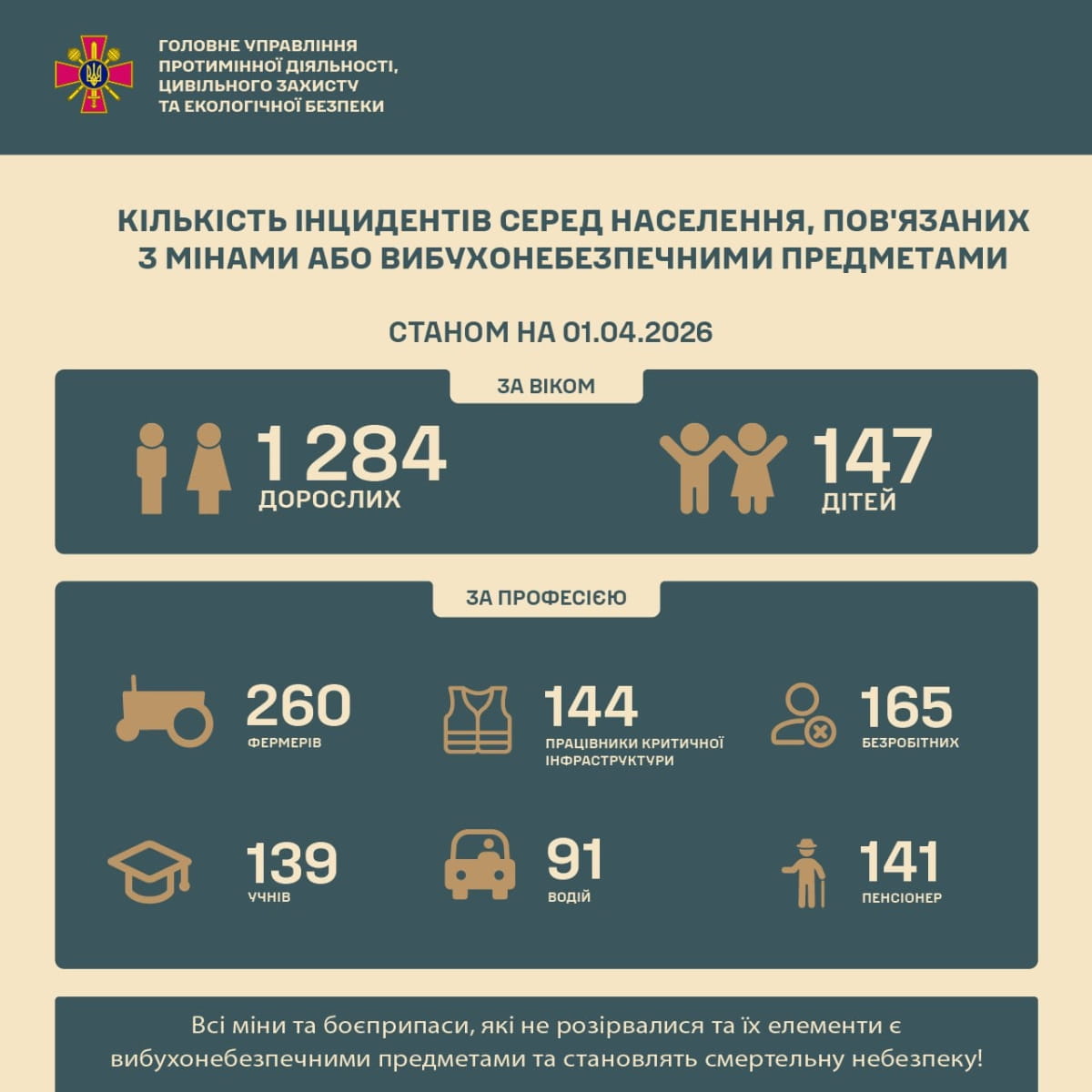 Від початку повномасштабного вторгнення і станом на 1 квітня 2026 року через ворожі міни та вибухонебезпечні залишки війни постраждала 1431 особа, з яких 147 – діти. Про таке повідомляє пресслужба Головного управління протимінної діяльності, цивільного захисту та екологічної безпеки.