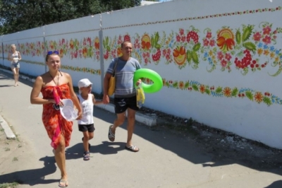 Українська художниця Ольга Черьомушкіна прикрасила ворота будівлі петриківським розписом довжиною 133 метри і шириною півтора метри.