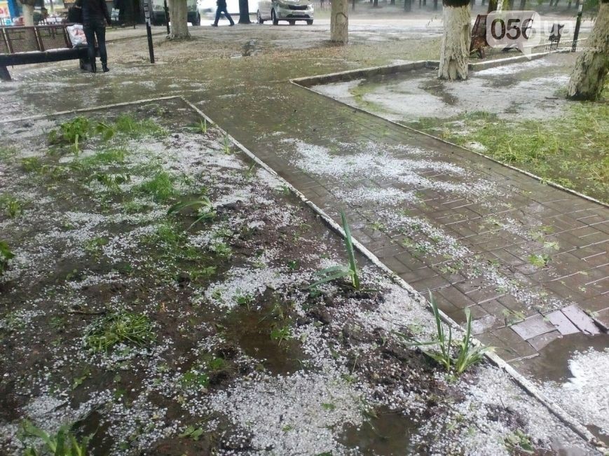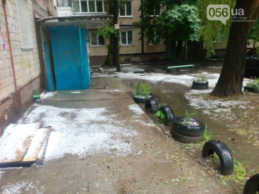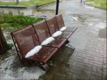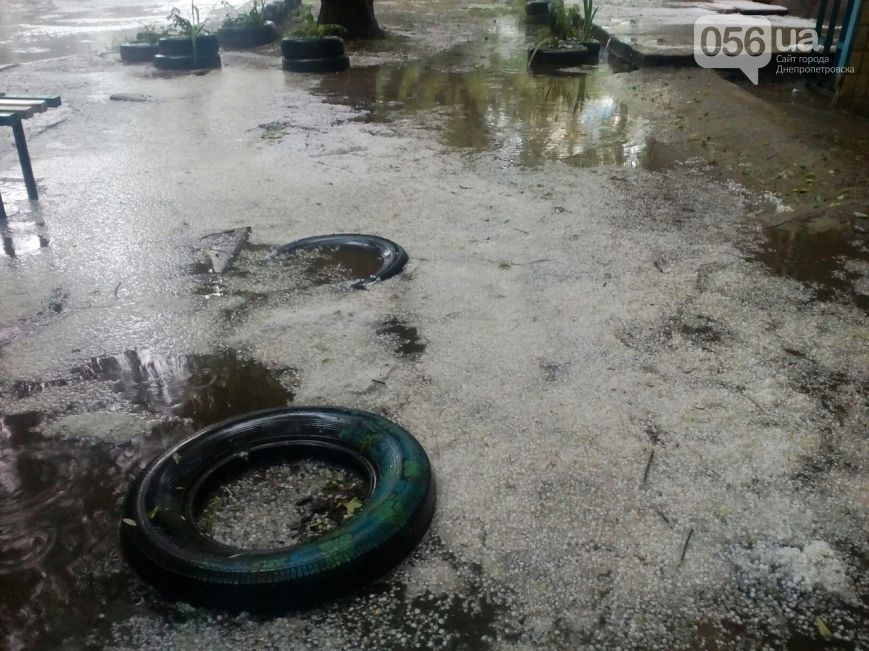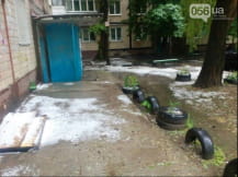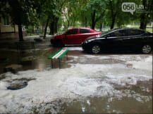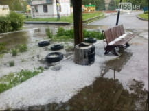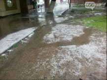 Окрім граду на "Тополі", сьогодні у місті весь день йшла справжня злива. Район Житлові масиви рясно поливало дощем і засипало градом. Як видно з відео, в величезних калюжах тонуть не тільки люди, а й міський транспорт.