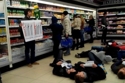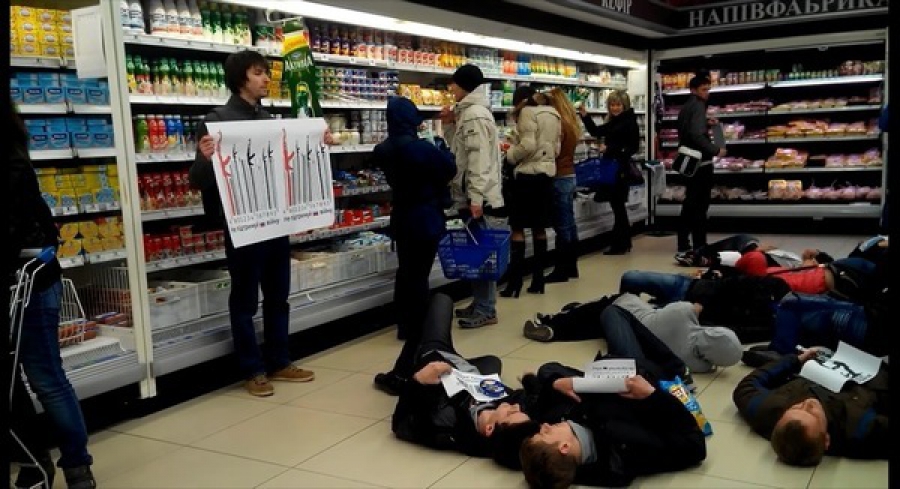 "Флешмоб відбувся 16 квітня одразу в трьох супермаркетах Дніпропетровська. Десятки "покупців" розшукали на полицях магазинів товари з російським штрих-кодом , зібрались в одному місці торгового залу, розгорнуть агітаційні плакати із лозунгом"Російське вбиває" і впали "замертво" на підлогу", - повідомили на сайті громадського руху у Дніпропетровську.