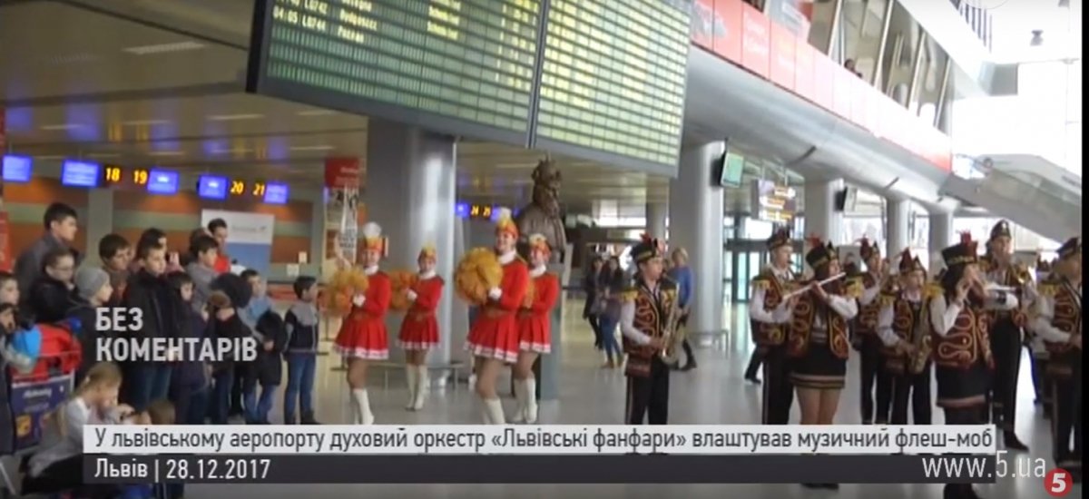 До новорічно-різдвяних свят у Львові влаштували музичний флешмоб. Духовий оркестр "Львівські фанфари" з дівчатами-мажоретками дав концерт у львівському аеропорту. У флешмобі взяли участь близько півсотні музикантів. Про це повідомляє "5 канал".