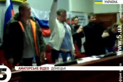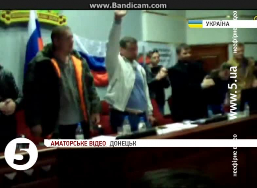 Там же раніше оголосили про створення незалежної "Донецької республіки", і одразу ж після цього – про входження новоствореної "республіки" до складу Російської федерації. Усі рішення сепаратисти вітають гучними оплесками.