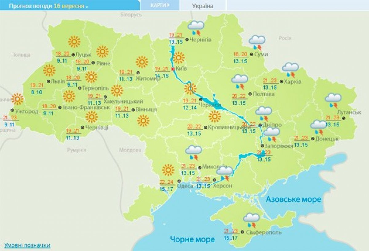 У суботу, 15 вересня, в Україні у більшості південних, східних та західних областей очікуються грози. На Приазов'ї місцями сильні дощі. Про таке повідомляє Український гідрометцентр.