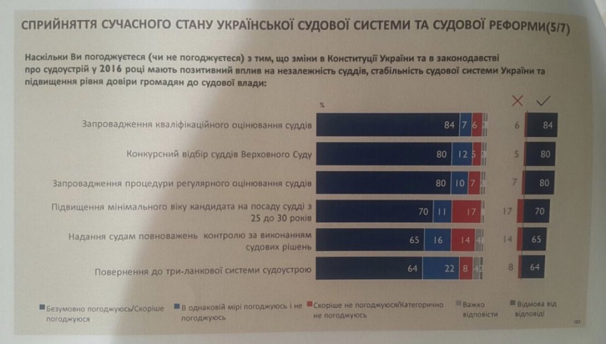 Зокрема, 85% опитаних позитивним вважають запровадження в рамках реформи кваліфікаційного оцінювання суддів, 80% - конкурсний відбір до Верховного Суду, 65% - надання судам контролю за виконанням судових рішень, 64% - повернення до триланкової системи судоустрою, 60% - скасування повноважень Президента щодо звільнення суддів, 62% - звуження суддівської недоторканості до функціональної, 50% - розширення повноваження Вищої ради правосуддя, створення, 61% ліквідація та реорганізація судів на підставі закону.