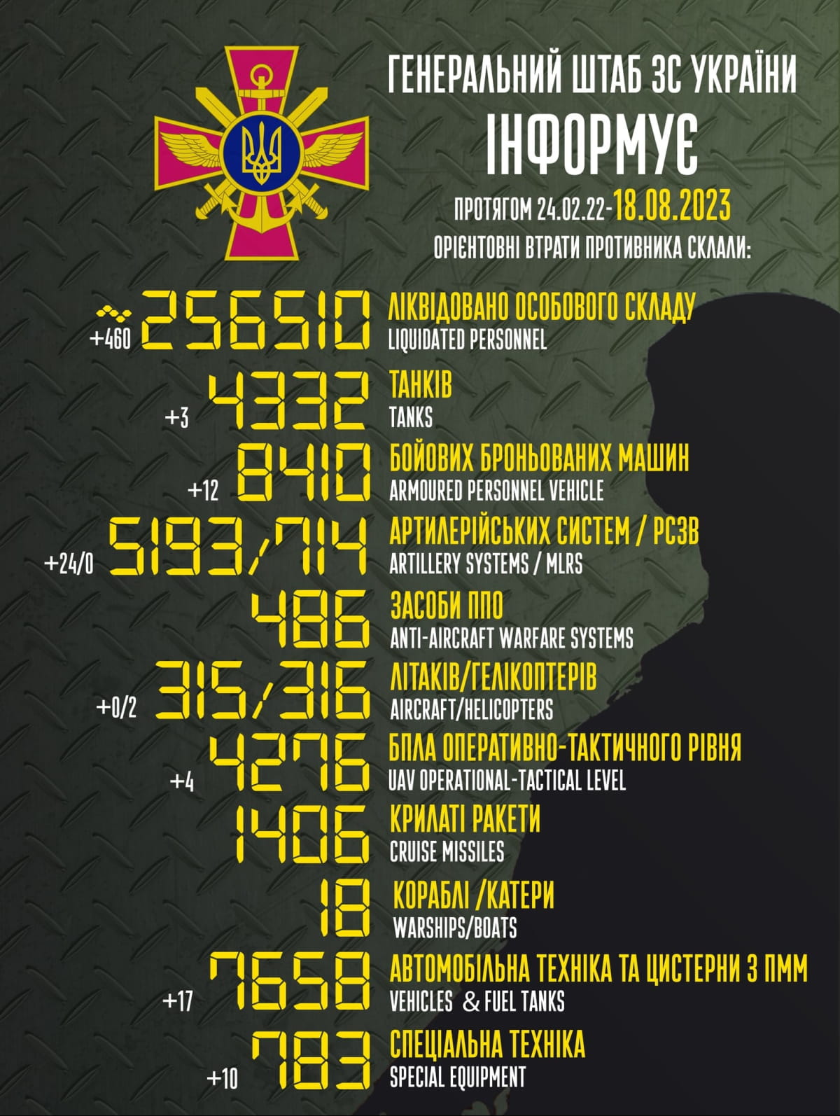 Загальні бойові втрати противника з 24.02.22 по 18.08.23 орієнтовно становлять: