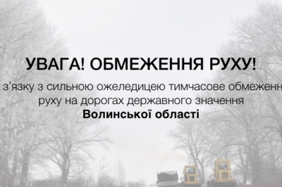 У четвер, 8 грудня, через несприятливі погодні умови обмежено рух транспорту на автодорогах загального користування на Волині. Відповідне обмеження діє від сьогодні з 9:00. Про це попереджає прес-служба "Укравтодору".