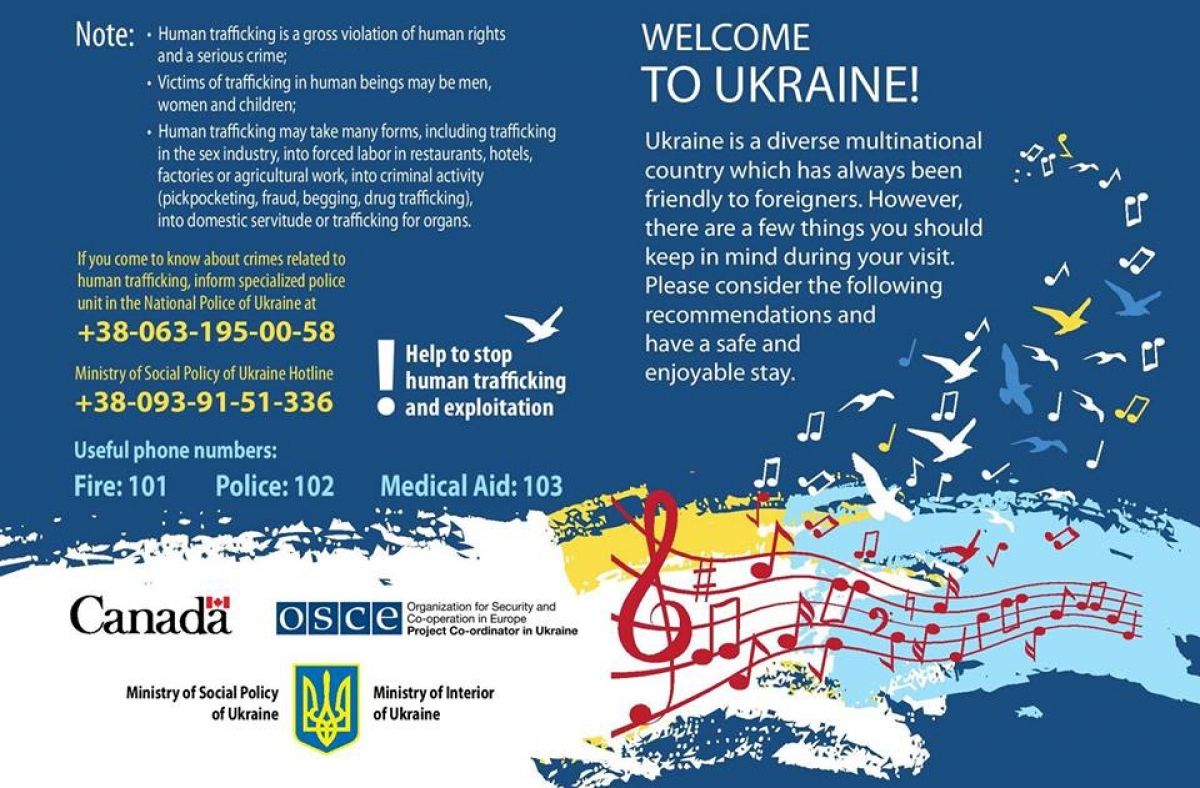"МВС України спільно з Міністерством соціальної політики України, OSCE Project Co-ordinator in Ukraine, Національною поліцією України та Державною прикордонною службою України підготували для іноземних гостей Євробачення-2017 інформаційні листівки. Вони повідомлятимуть туристів про небезпеку торгівлі людьми, заборонені дії на території України та алгоритм звернення до відповідних органів у разі необхідності", – йдеться в повідомленні.