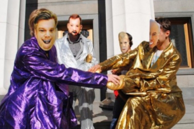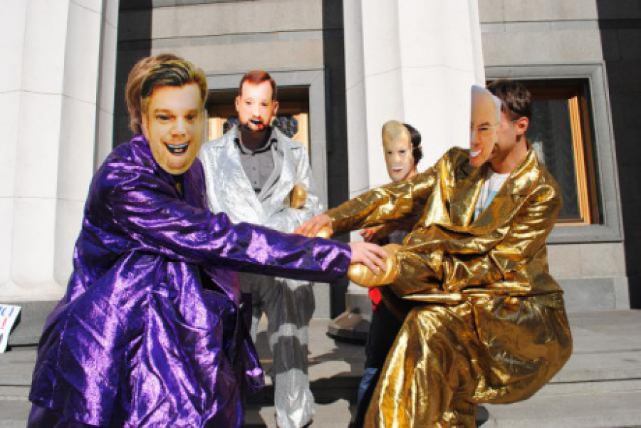 Активісти у масках Віктора та Олександра Януковичів, Пшонки, Азарова та інших "подякували народним депутатам за те, що ті досі не ухвалили законопроект, яким утворюється антикорупційне Бюро".