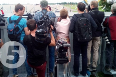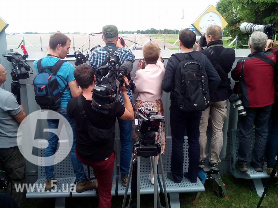 Про прибуття президентського кортежу повідомляє кореспондент "5 каналу". Декілька десятків журналістів перебувають в аеропорту, проте їх не пускають на злітну смугу, тому вони знімають через паркан.
