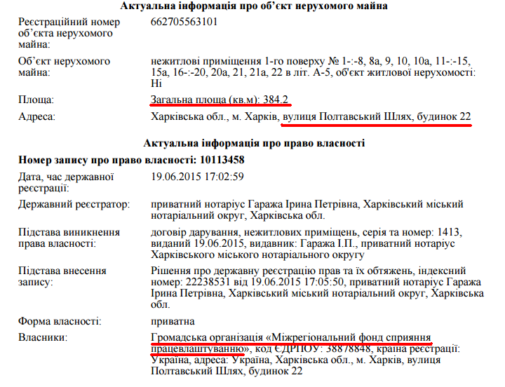 У повідомленні зазначено, що у власності ГО "Міжрегіональний фонд сприяння працевлаштуванню" перебувають приміщення колишнього обкому загальною площею 384,2 кв.м., а також 4 квартири – в Ізюмі, Первомайському, Лозовій та Краснограді. Ці квартири розташовані за адресами, де раніше знаходилися горкоми та райкоми КПУ.