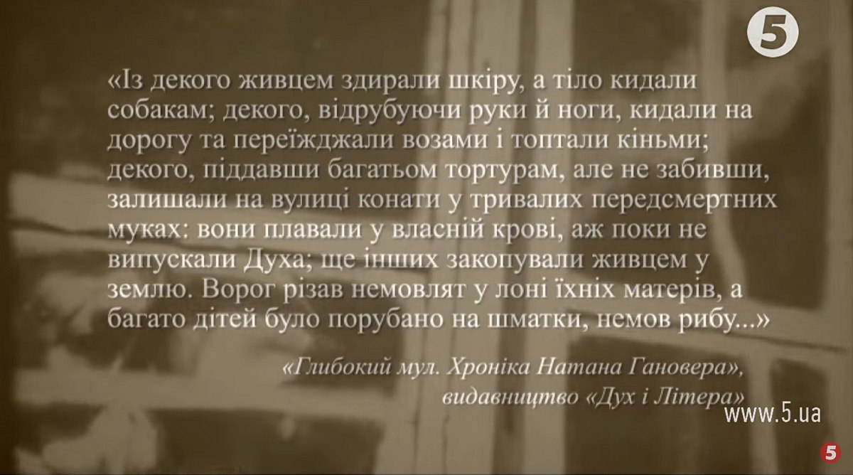 Світ дізнався про жахливу долю євреїв України з книжки рабина Натана Гановера, виданої 1653-го у Венеції – невдовзі вона була перекладена багатьма мовами і стала бестселером. У своїх спогадах Ганновер подає жахливу картину звірств українців.