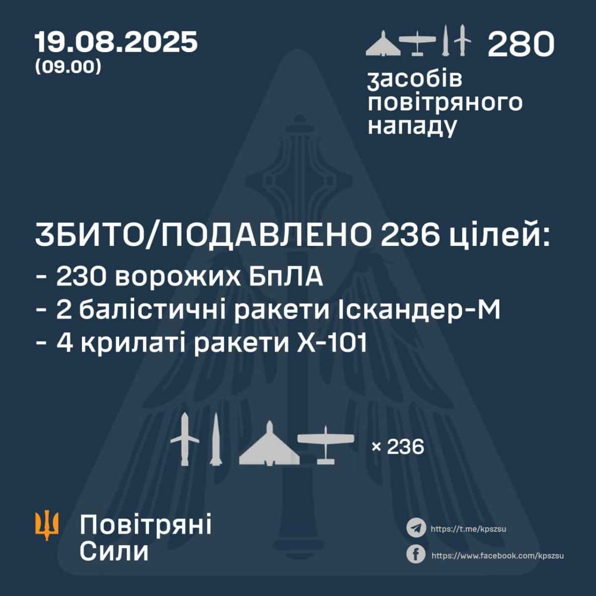 У ніч на 19 серпня російська армія атакувала Україну 280-ма засобами повітряного нападу. Сили оборони змогли знищити та подавити 236 із них.