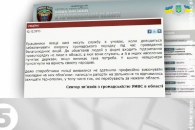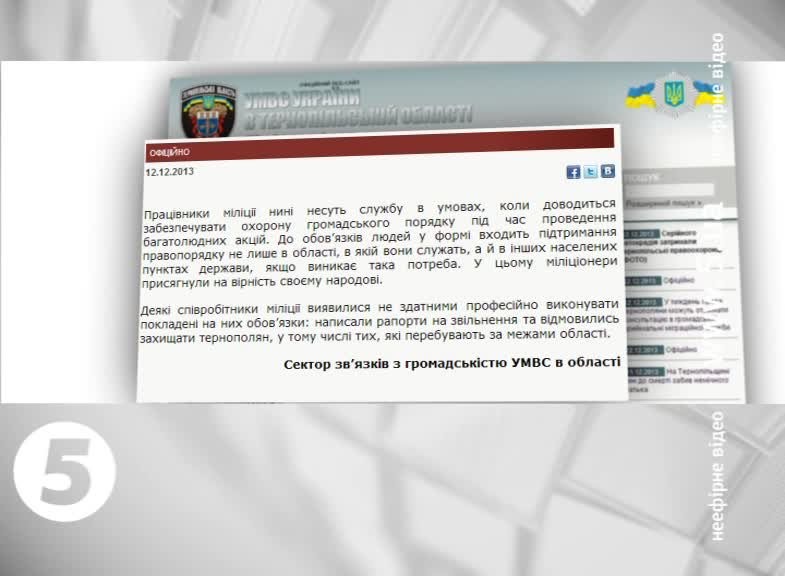 У ньому йдеться: правоохоронці нині працюють в умовах коли слід забезпечувати порядок під час проведення масових акцій. І звільнення в МВС пояснюють відмовою деяких працівників цитуємо: «Захищати мешканців Тернопільщини за межами регіону», кінець цитати. Також в управлінні зазначають, міліціонери зобов’язані забезпечувати порядок не лише в області, де вони працюють, а й в інших населених пунктах, якщо виникає така потреба.