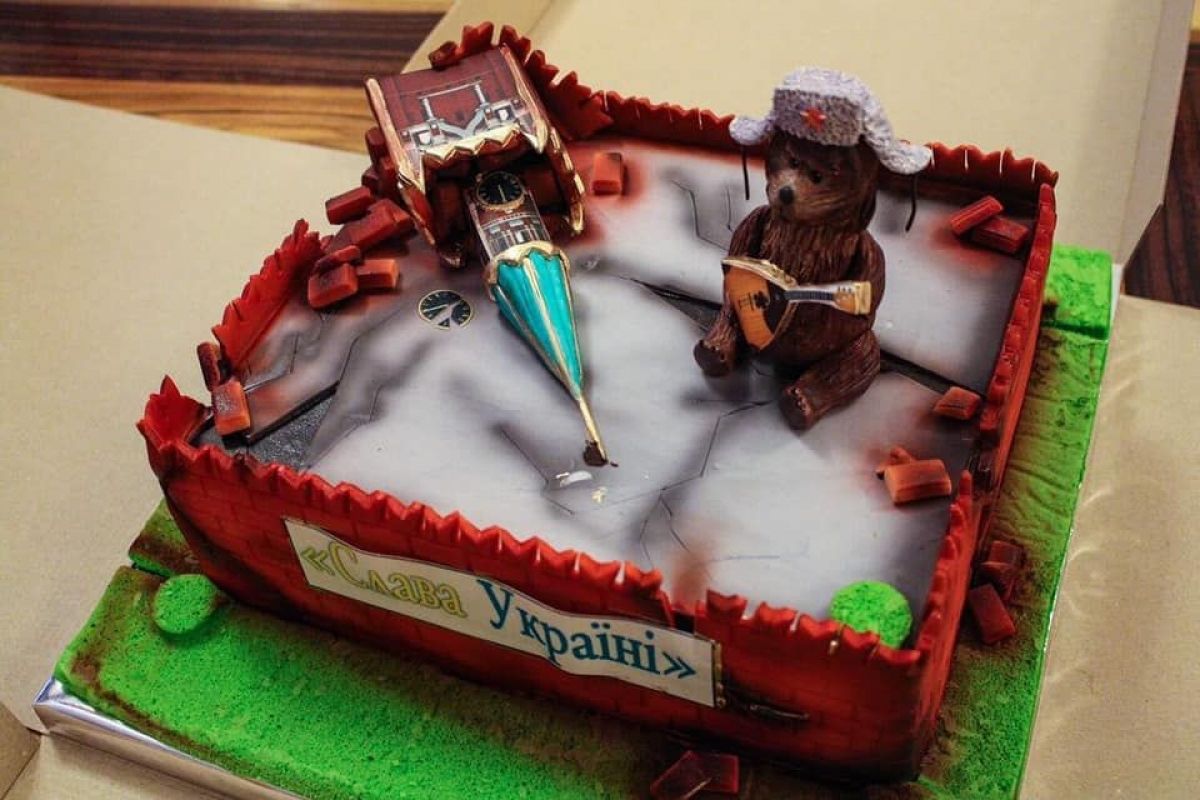 Кондитерський виріб прикрашений їстівним ведмедем у шапці-вушанці і з червоною зіркою, який тримає в лапах балалайку. На одній зі стін торту у вигляді зруйнованого Кремля з поваленою баштою розміщено напис "Слава Україні!"