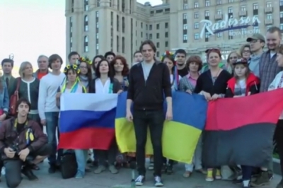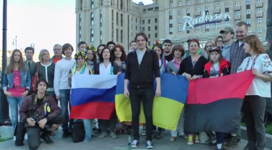 Активісти були одягнені в українські національні костюми і мали зі собою синьо-жовтий, червоно-чорний прапор і російський триколор.