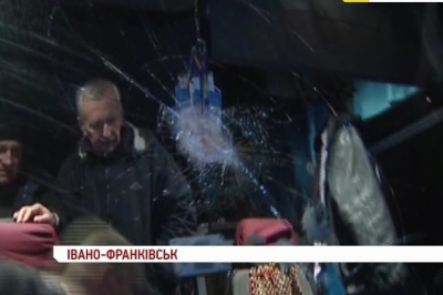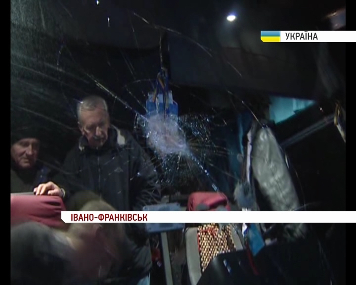Два камені опинилися у салоні автобуса. Ними зловмисники розбили вщент лобове скло. В салоні були 53 пасажири. Вони не постраждали. Однак тілесних ушкоджень зазнав водій, в нього поранене обличчя. Інцидент стався на виїзді з Івано-Франківська, очевидці кажуть, зловмисників було двоє. Все сталося неочікувано. Молоді хлопці кинули камені і швидко втекли.