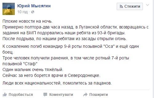 "У Луганській області, повертаючись із завдання, на БМП підірвалися наші хлопці з 93-ї бригади. Після підриву по наших хлопцях із засідки відкрили вогонь", – зазначив волонтер.
