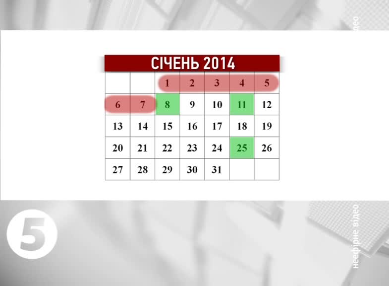 Утім, за документом, святкові дні потрібно буде відпрацьовувати: 11-го, 25-го січня та 8-го лютого 2014 року. Раніше прем'єр Микола Азаров, нагадаємо, заявляв, що Україна не може дозволити собі, цитуємо «суцільні загули на свята», кінець цитати. На думку Азарова, це дорого коштуватиме вітчизняній економіці. Прем’єр припускав, що найімовірніше уряд ухвалить рішення працювати за календарним графіком.